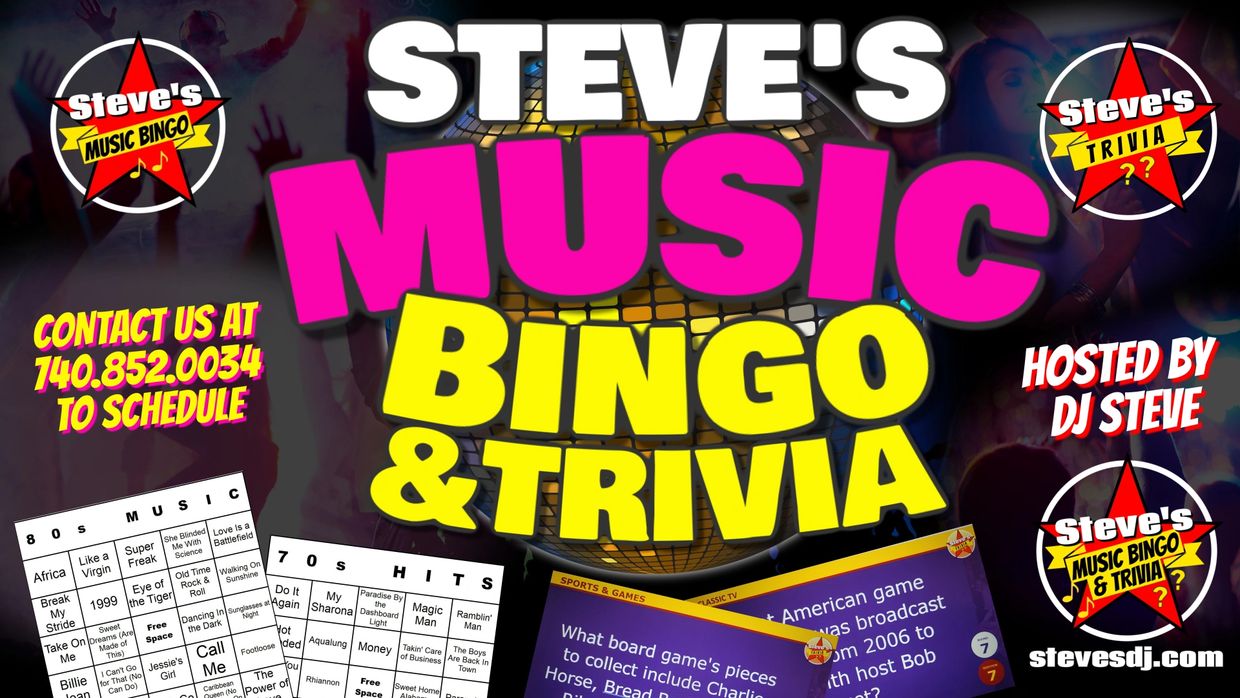 Introducing Steve's Music Bingo! A fun bingo game with songs replacing the numbers on a bingo card. We play the music and if you have that song listed on your card, you mark it off! 5 winners each game with Bingo, Four Corners, Double Bingo, Picture Frame and Black Out!